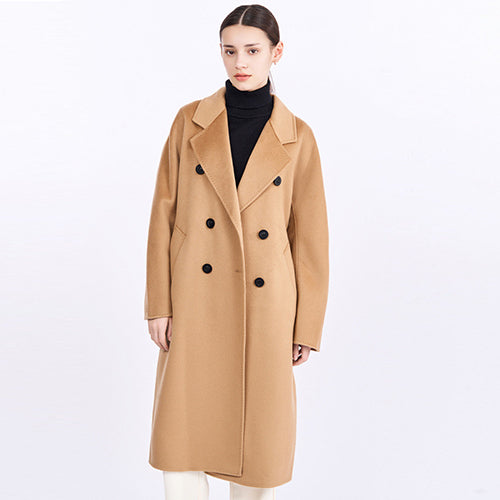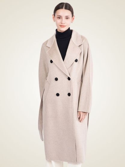 Wrap yourself in the refined luxury of the Double-Breasted Cashmere Coat. Its structured silhouette, enhanced by a tailored lapel and a cinched waist, creates an effortlessly elegant look. The double-breasted closure and deep pockets offer both style and practicality, making it a timeless staple in any wardrobe.