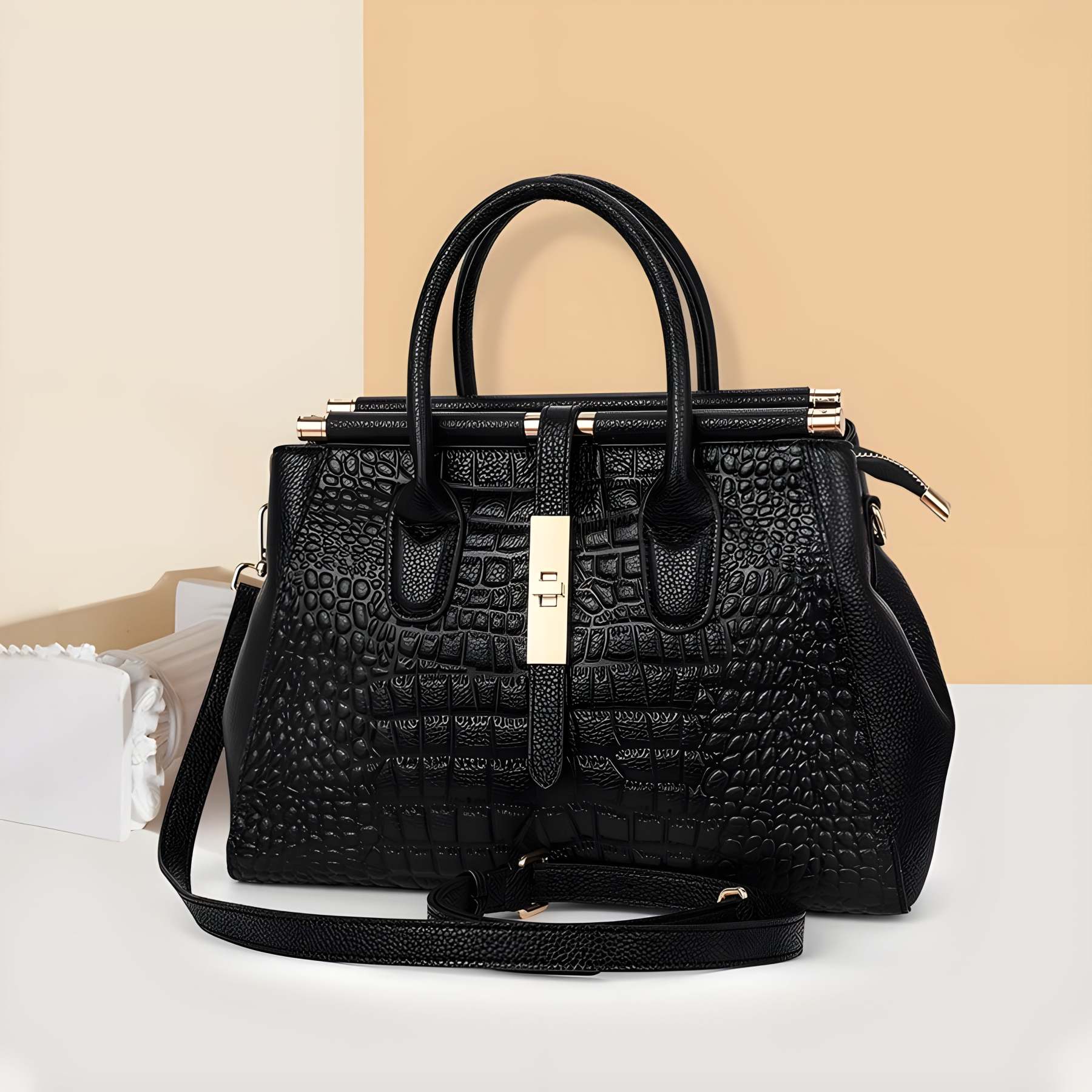 From morning meetings to evening soirées, this structured leather bag commands attention with its luxurious crocodile embossing and gleaming gold hardware. The refined silhouette pairs effortlessly with both tailored suits and casual ensembles.