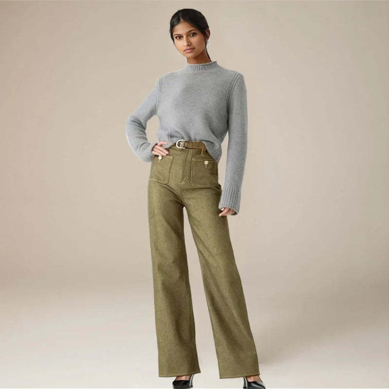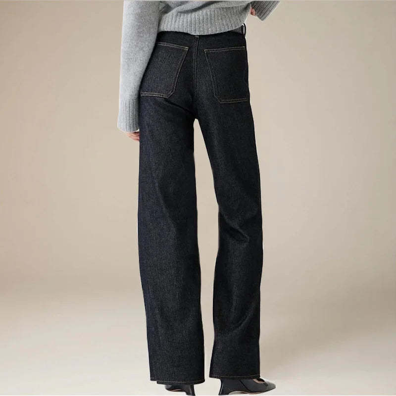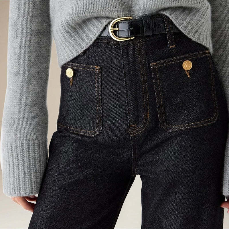 Channeling vintage Parisian workwear, these high-rise jeans feature statement brass button pockets and a sophisticated wide-leg silhouette. The light-wash denim drapes elegantly from hip to hem, creating a refined yet relaxed aesthetic.