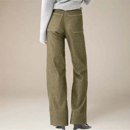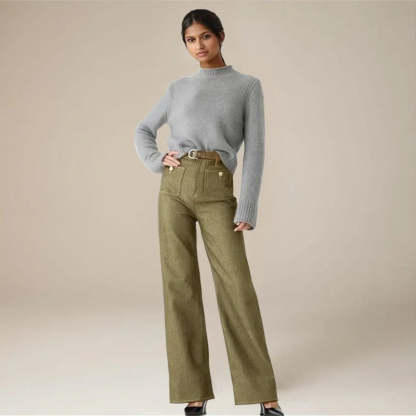 • High-rise fit with front utility pockets and brass hardware